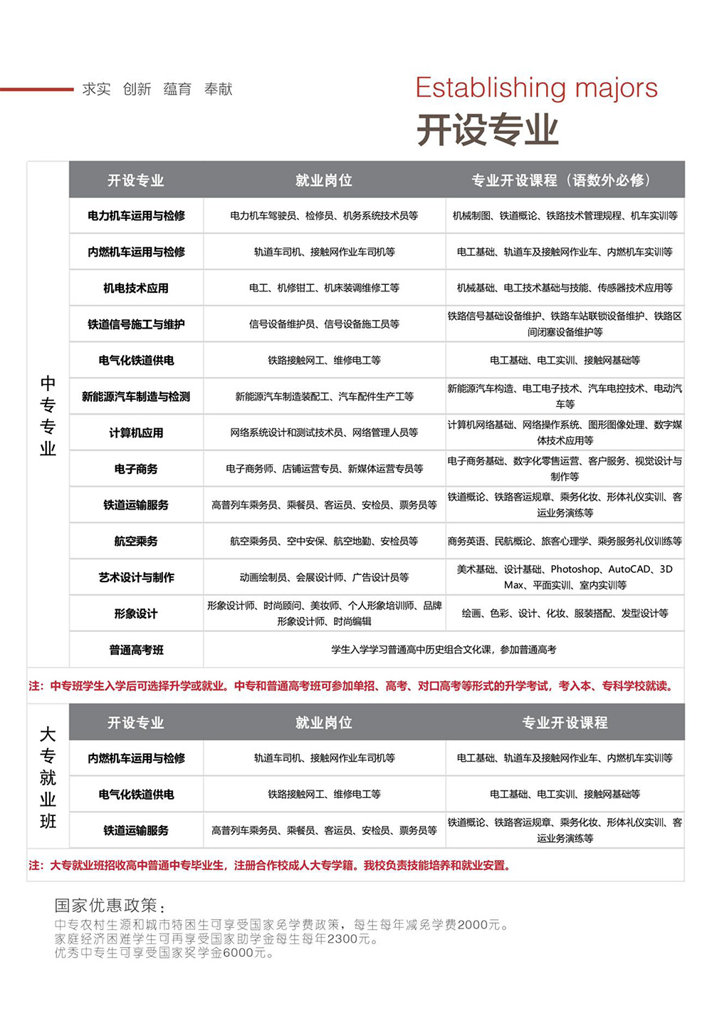 电力机车作用与检修,机电技术应用,电气化铁道供电,新能源汽车制造与检测,计算机应用,电子商务,铁道运输服务,航空乘务,艺术设计与制作,形象设计。